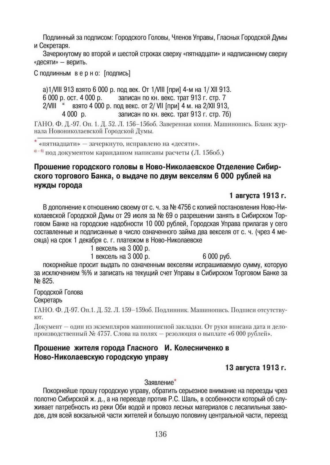 Прошение жителя города Гласного И. Колесниченко в Ново-Николаевскую городскую управу. 13 августа 1913 г. // ГАНО. Ф. Д-97. Оп. 1. Д. 49. Л. 54–54об. Рукописный подлинник.