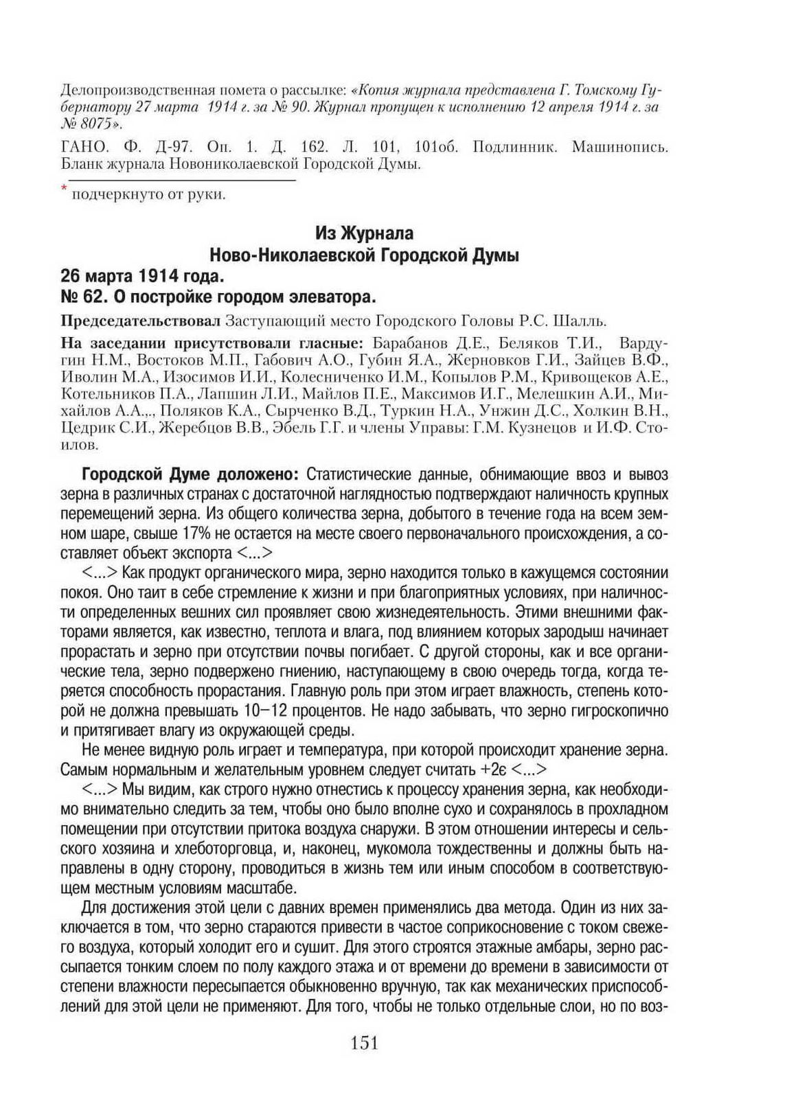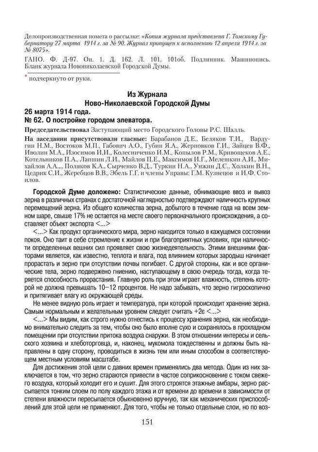 Из Журнала Ново-Николаевской Городской Думы. 26 марта 1914 года. № 62. О постройке городом элеватора // ГАНО. Ф. Д-97. Оп. 1. Д. 90. Л. 114–122. Заверенная копия. Машинопись.