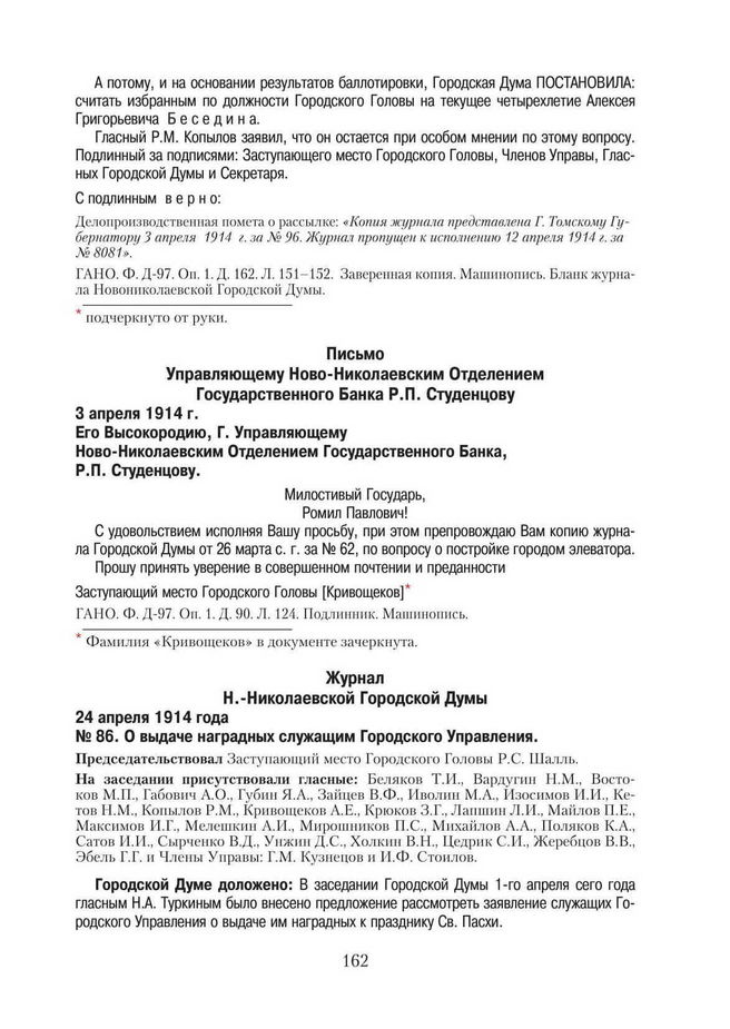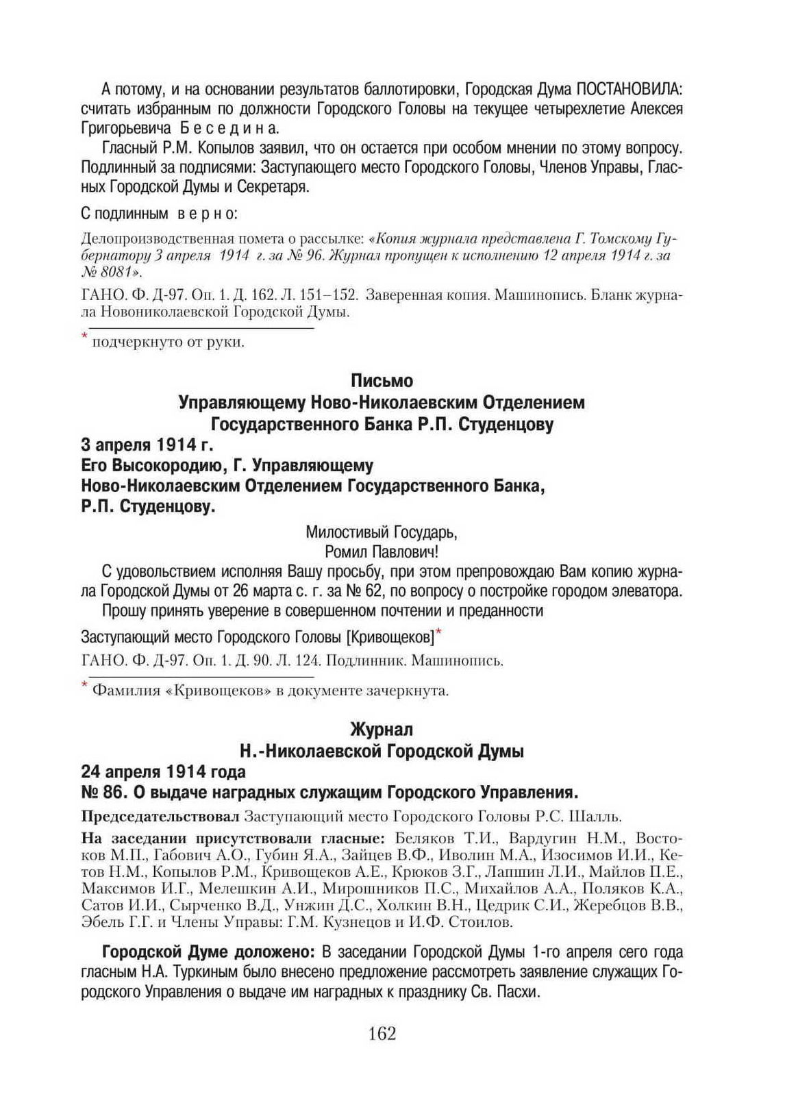 Журнал Н.-Николаевской Городской Думы. 24 апреля 1914 года. № 86. О выдаче наградных служащим Городского Управления // ГАНО. Ф. Д-97. Оп. 1. Д. 162. Л. 155–156. Заверенная копия. Машинопись.