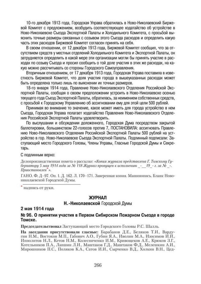 Журнал Н.-Николаевской Городской Думы. 2 мая 1914 года. № 96. О принятии участия в Первом Сибирском Пожарном Съезде в городе Томске // ГАНО. Ф. Д-97. Оп. 1. Д. 162. Л. 199–199 об. Заверенная копия. Машинопись.