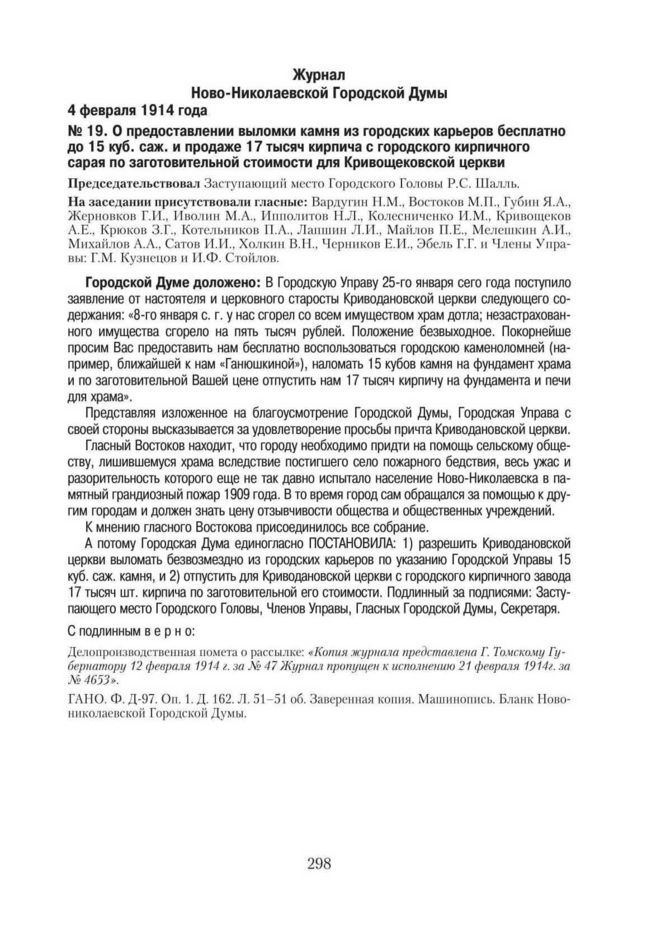 Журнал Ново-Николаевской Городской Думы. 4 февраля 1914 года. № 19. О предоставлении выломки камня из городских карьеров бесплатно до 15 куб. саж. и продаже 17 тысяч кирпича с городского кирпичного сарая по заготовительной стоимости для Кривощековской церкви // ГАНО. Ф. Д-97. Оп. 1. Д. 162. Л. 51–51 об. Заверенная копия. Машинопись.