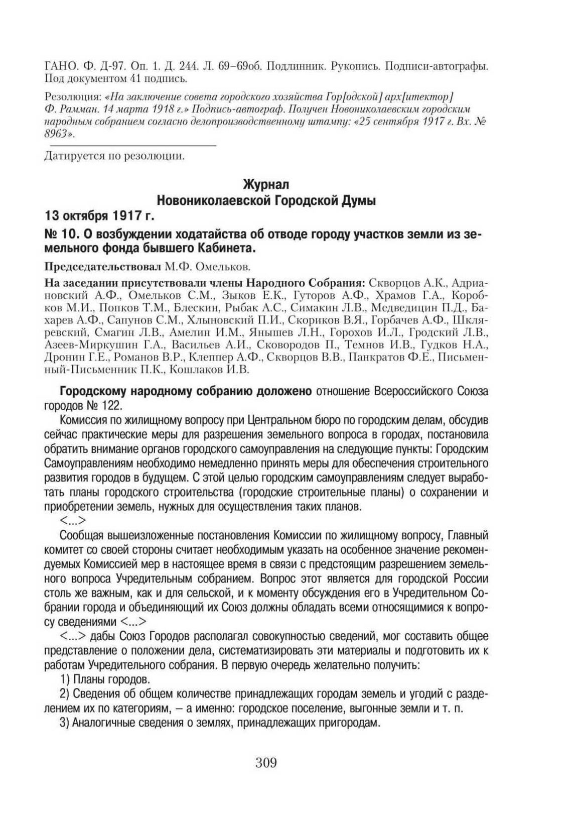 Журнал Новониколаевской Городской Думы. 13 октября 1917 г. № 10. О возбуждении ходатайства об отводе городу участков земли из земельного фонда бывшего Кабинета // ГАНО.Ф. Д-97. Оп. 1. Д. 259. Л. 5–6. Заверенная копия. Машинопись.