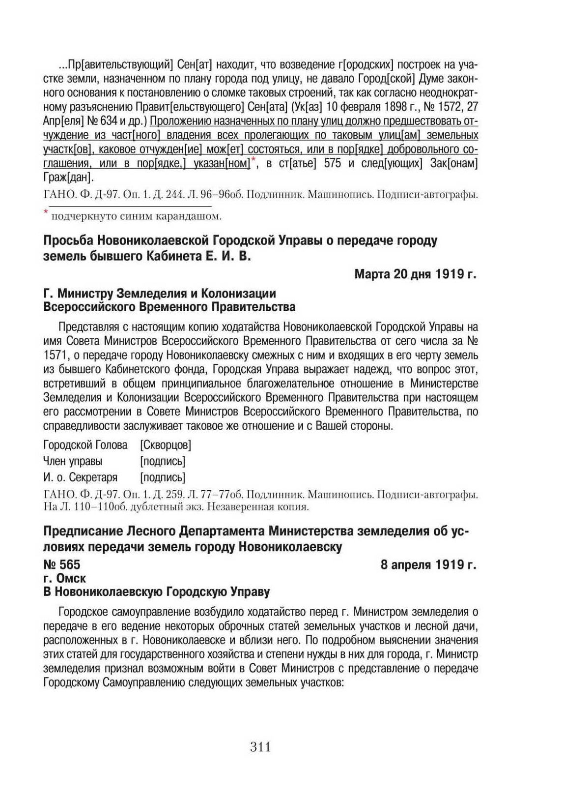 Просьба Новониколаевской Городской Управы о передаче городу земель бывшего Кабинета Е. И. В. Марта 20 дня 1919 г. // ГАНО. Ф. Д-97. Оп. 1. Д. 259. Л. 77–77об. Подлинник. Машинопись. Подписи-автографы. На Л. 110–110об. дублетный экз. Незаверенная копия.