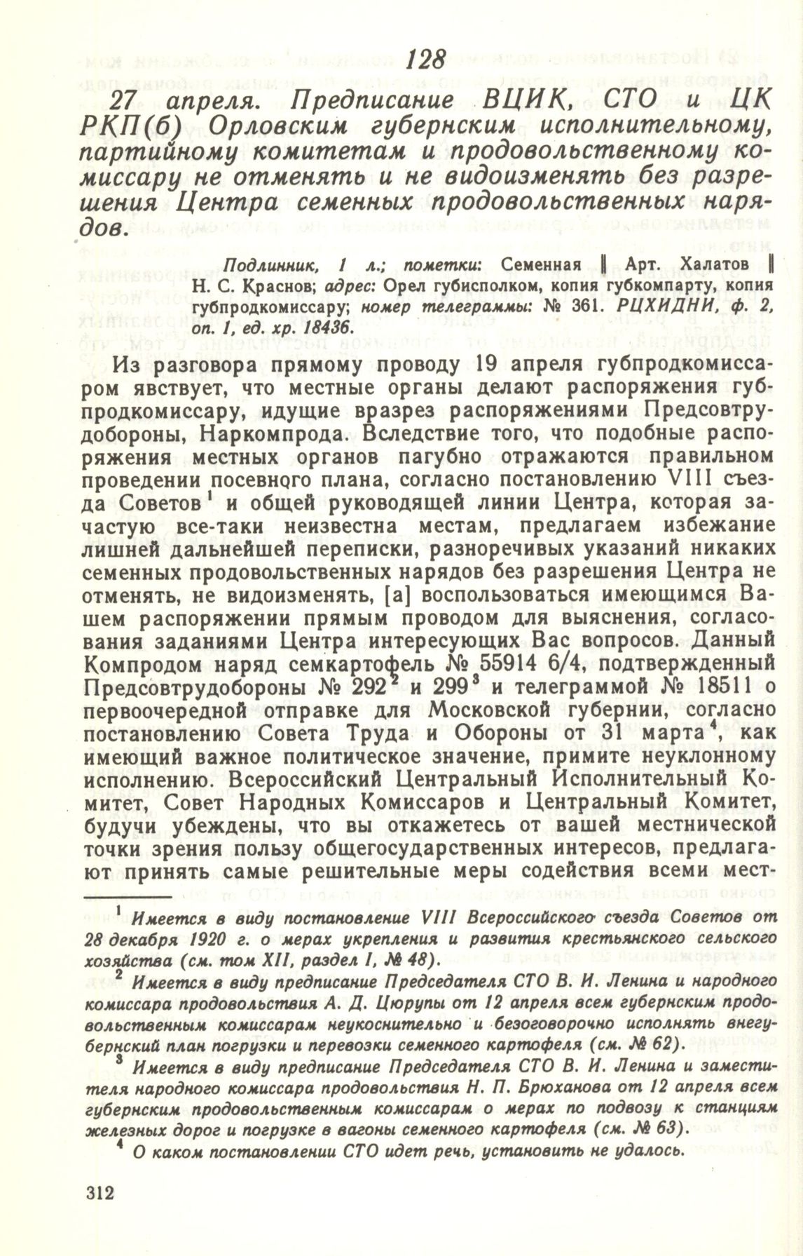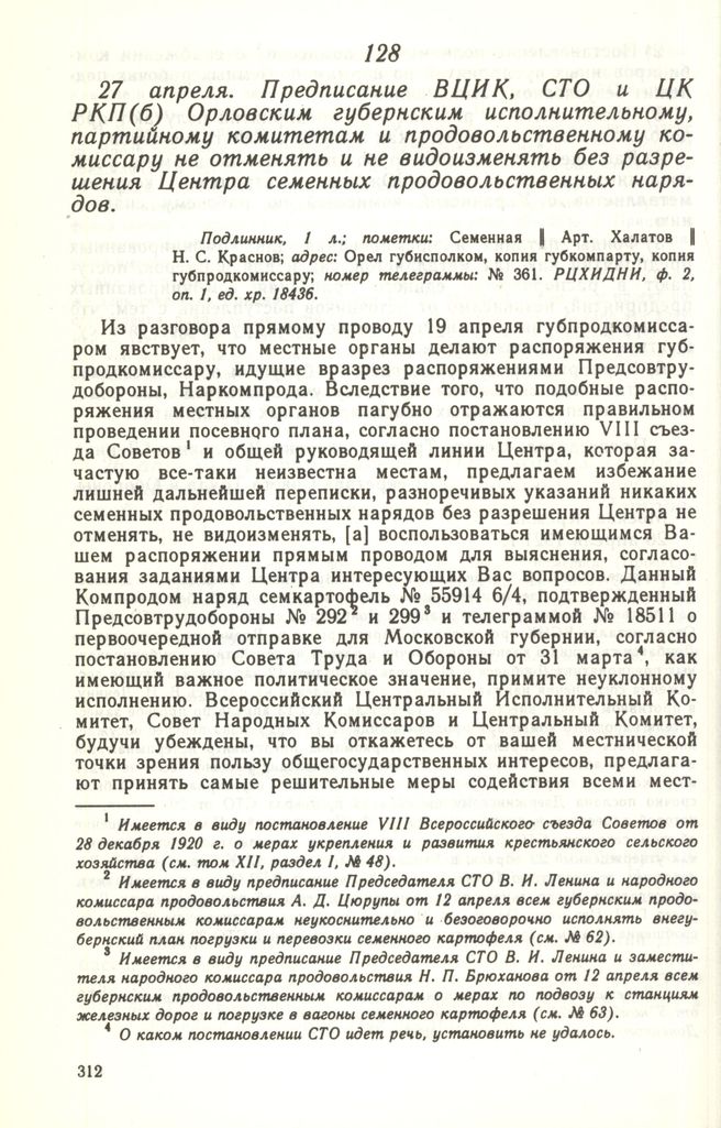 27 апреля. Предписание ВЦИК, СТО и ЦК РКП(б) Орловским губернским исполнительному, партийному комитетам и продовольственному комиссару не отменять и не видоизменять без разрешения Центра семенных продовольственных нарядов // Подлинник, 1 л.; пометки: Семенная || Арт. Халатов || Н. С. Краснов; адрес: Орел губисполком, копия губкомпарту, копия губпродкомиссару; номер телеграммы: № 361. РЦХИДНИ, ф. 2, оп. 1, ед. хр. 18436.