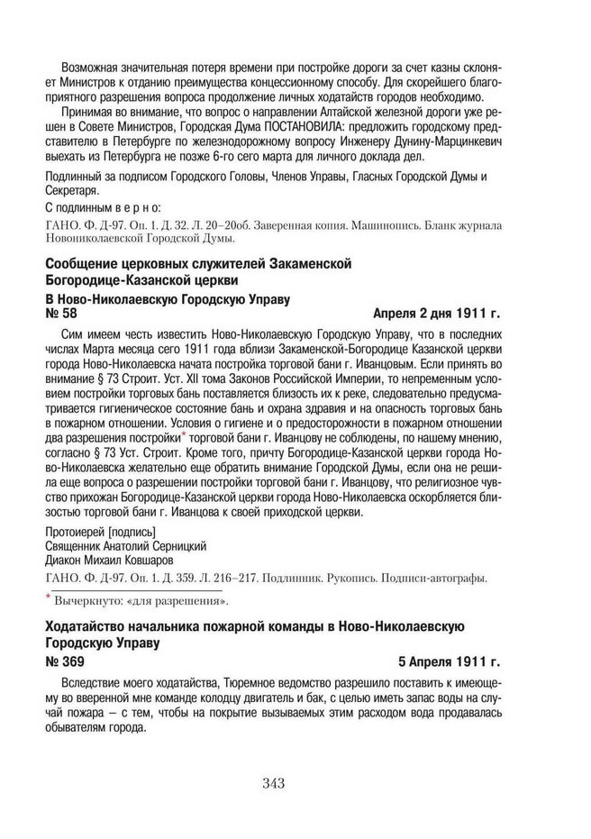Сообщение церковных служителей Закаменской Богородице-Казанской церкви в Ново-Николаевскую Городскую Управу. Апреля 2 дня 1911 г. // ГАНО. Ф. Д-97. Оп. 1. Д. 359. Л. 216–217. Подлинник. Рукопись. Подписи-автографы.