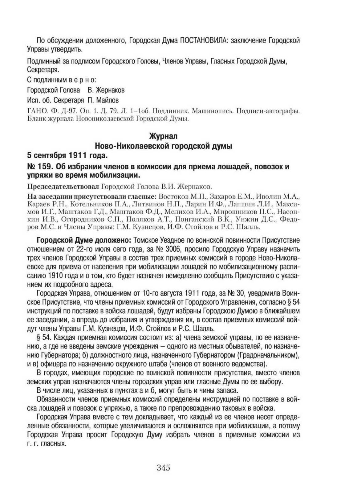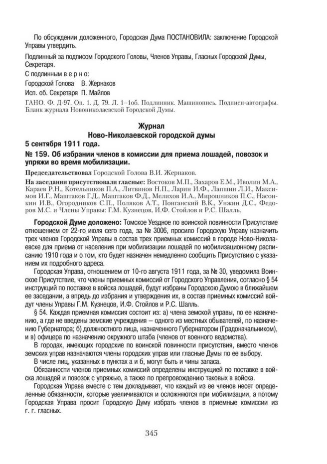 Журнал Ново-Николаевской городской думы. 5 сентября 1911 года. № 159. Об избрании членов в комиссии для приема лошадей, повозок и упряжи во время мобилизации // ГАНО. Ф. Д-97. Оп. 1. Д. 79. Л. 2–2об. Подлинник. Машинопись. Подписи-автографы