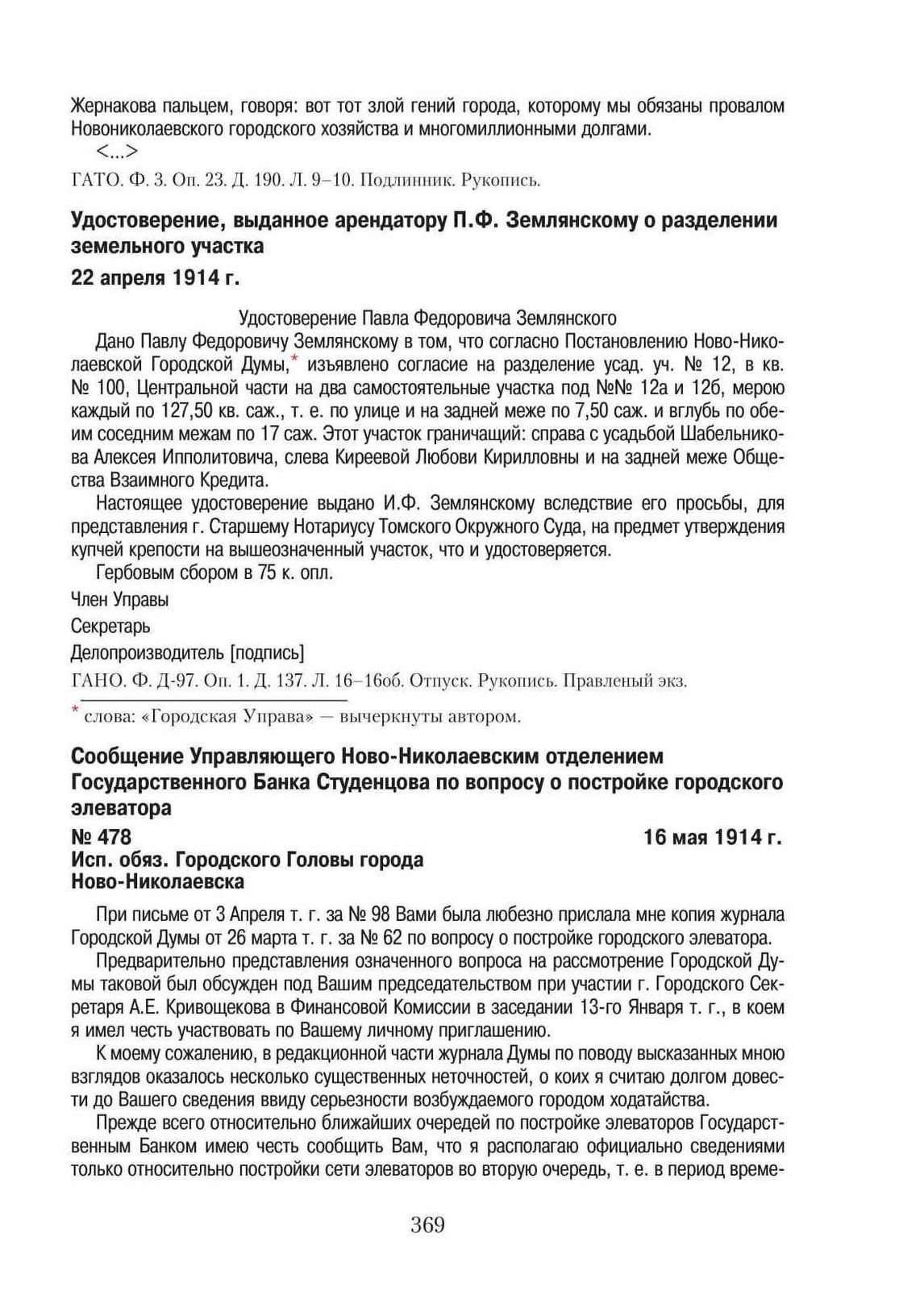 Сообщение Управляющего Ново-Николаевским отделением Государственного Банка Студенцова по вопросу о постройке городского элеватора. 16 мая 1914 г. // ГАНО. Ф. Д-97. Оп. 1. Д. 90. Л. 127–128. Подлинник. Машинопись. Подпись-автограф.