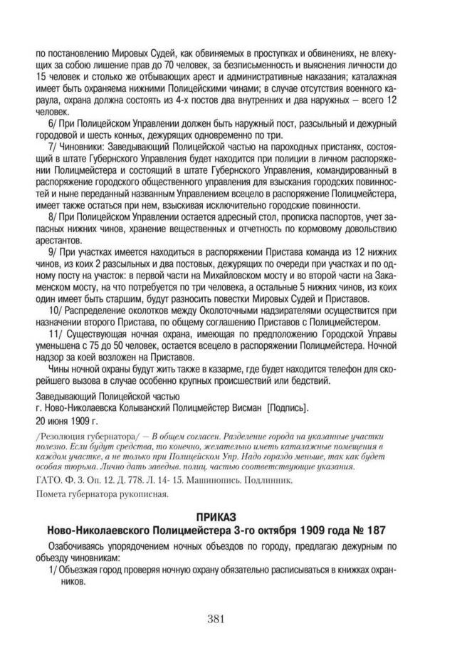 Приказ Ново-Николаевского Полицмейстера 3-го октября 1909 года № 187 // ГАТО. Ф. 3. Оп. 12. Д. 778. Л. 22.Машинопись. Подлинник.