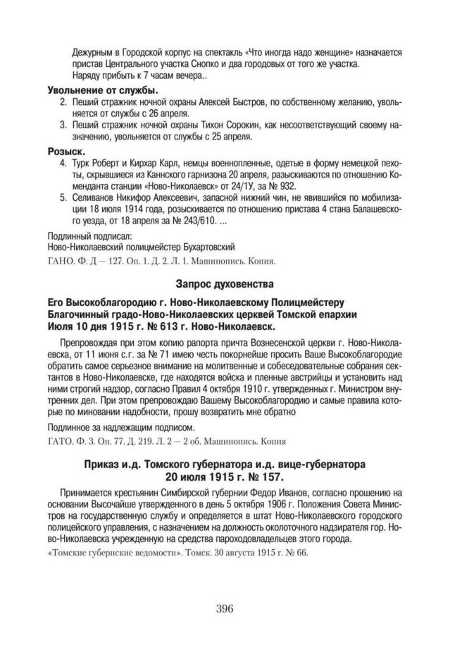Его Высокоблагородию г. Ново-Николаевскому Полицмейстеру Благочинный градо-Ново-Николаевских церквей Томской епархии. Июля 10 дня 1915 г. // ГАТО. Ф. 3. Оп. 77. Д. 219. Л. 2-2 об. Машинопись. Копия.