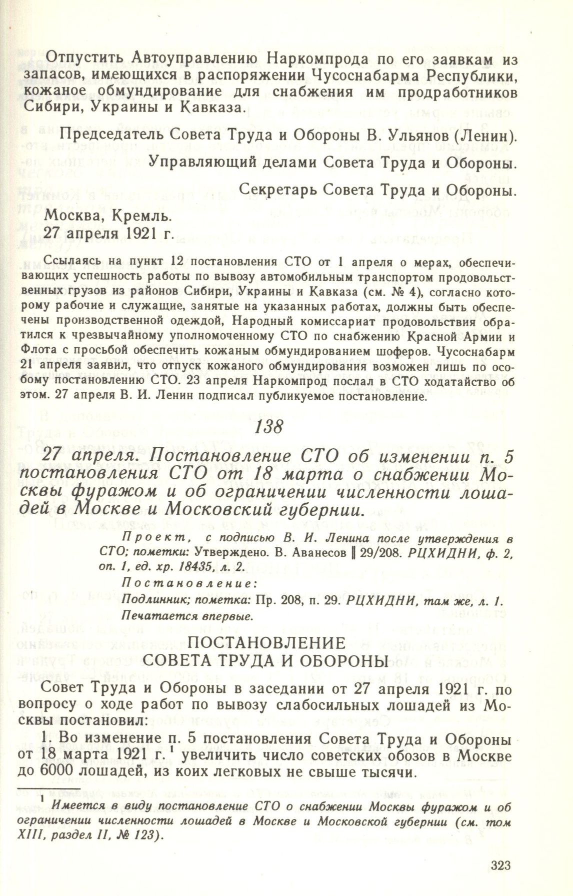27 апреля. Постановление СТО об изменении п. 5 постановления СТО от 18 марта о снабжении Москвы фуражом и об ограничении численности лошадей в Москве и Московской губернии // Проект, с подписью В. И. Ленина после утверждения в СТО; пометки: Утверждено. В. Аванесов || 29/208. РЦХИДНИ, ф. 2, оп. 1, ед. хр. 18435. л. 2. Постановление: Подлинник: пометка: Пр. 208, п. 29. РЦХИДНИ, там же, л. 1. Печатается впервые.