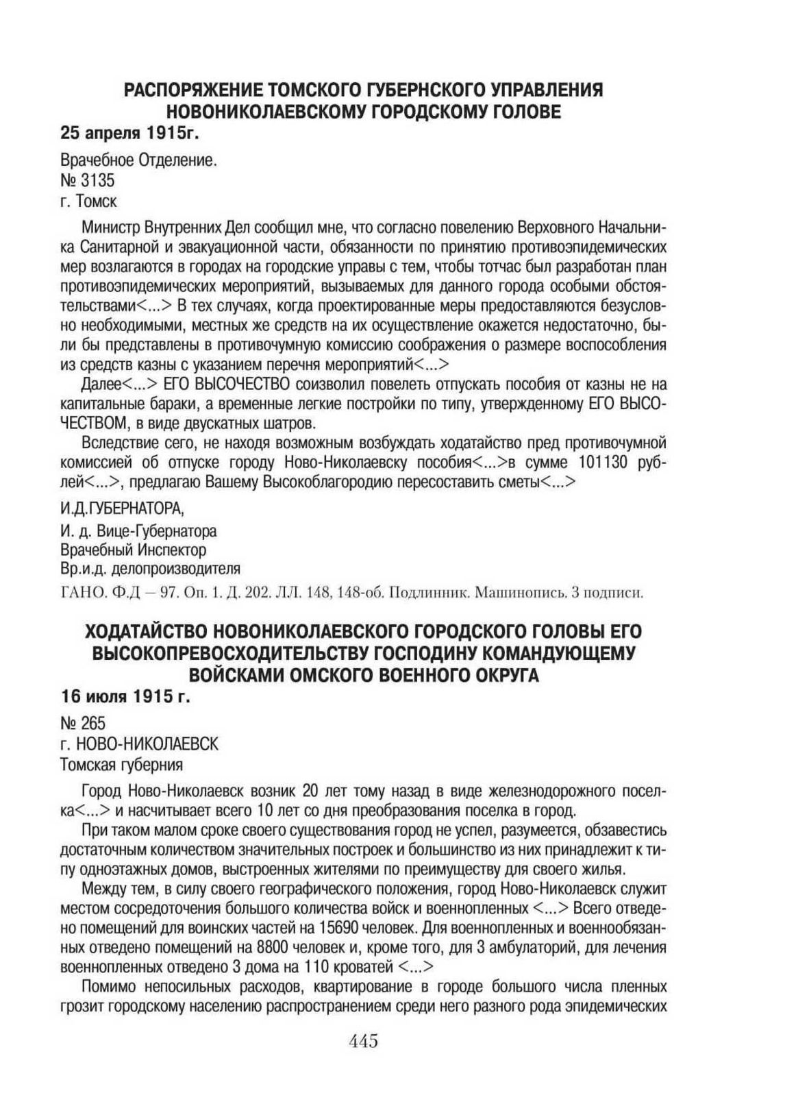 Ходатайство Новониколаевского Городского Головы Его Высокопревосходительству господину Командующему войсками Омского военного округа. 16 июля 1915 г. // ГАНО. Ф. Д-97. Оп. 1. Д. 202. ЛЛ. 173-176. Копия. Машинопись.