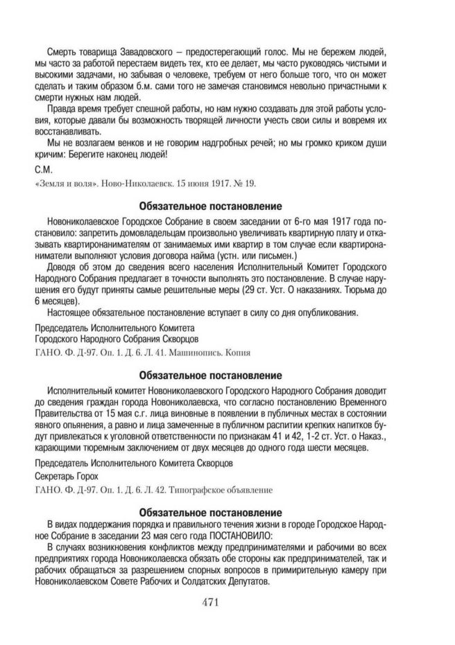 Обязательное постановление Новониколаевского Городского Народного Собрания.15-го мая 1917 года // ГАНО. Ф. Д-97. Оп. 1. Д. 6. Л. 42. Типографское объявление.