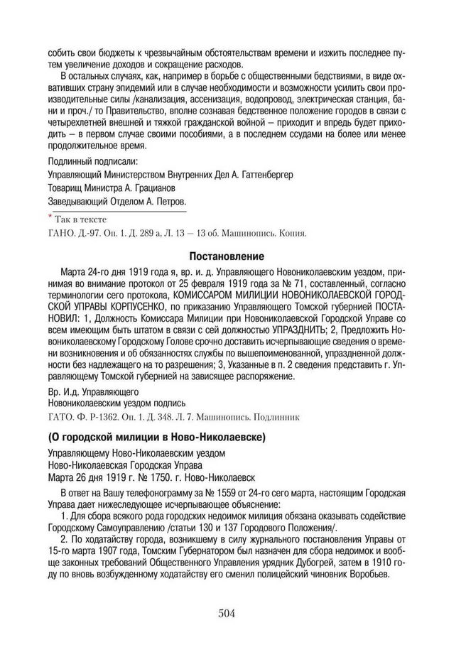 О городской милиции в Ново-Николаевске. Марта 26 дня 1919 г. // ГАТО. Ф. Р-1362. оп. 1. Д. 348. Л. 6-6 об. Машинопись. Подлинник.