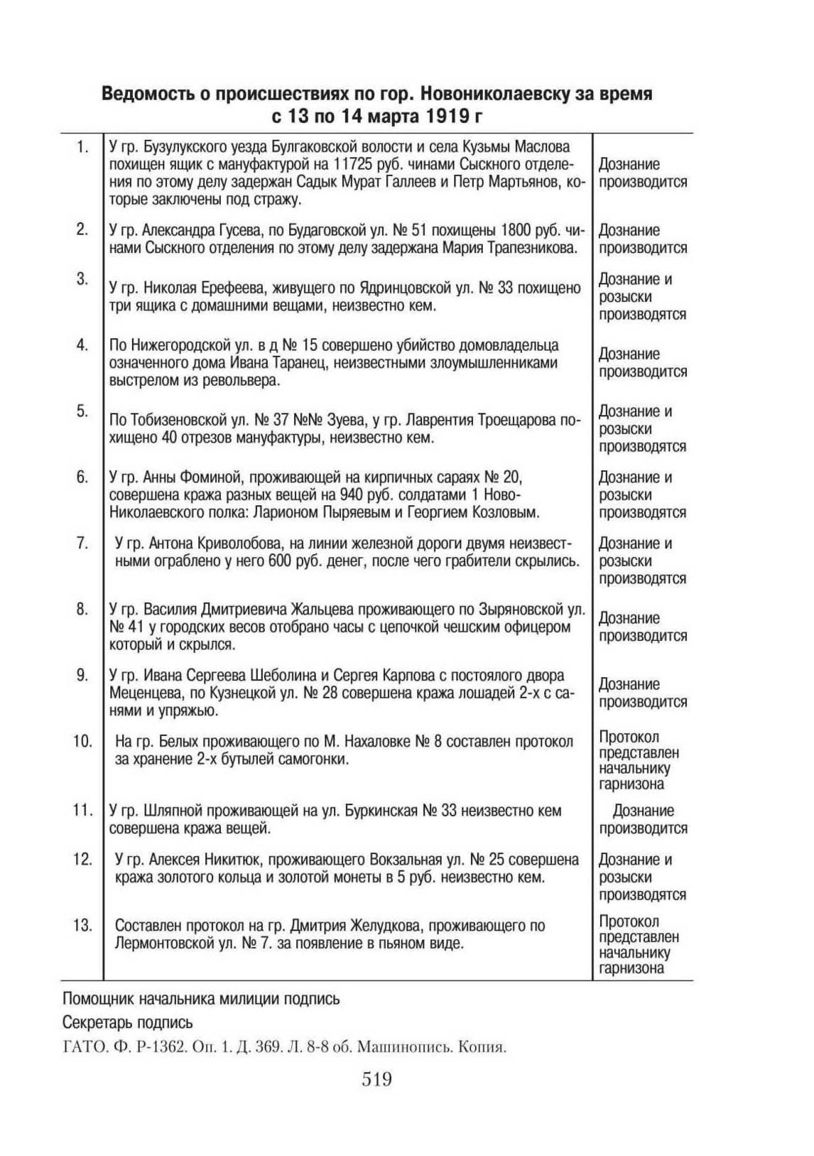 Ведомость о происшествиях по гор. Новониколаевску за время с 13 по 14 марта 1919 г. // ГАТО. Ф. Р-1362. Оп. 1. Д. 369. Л. 8-8 об. Машинопись. Копия.