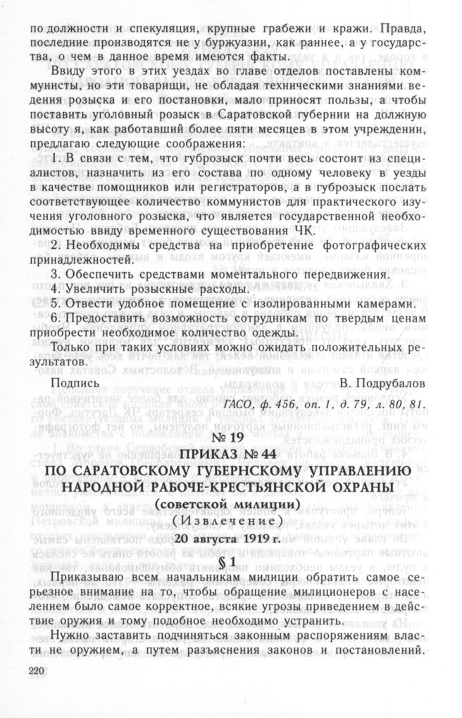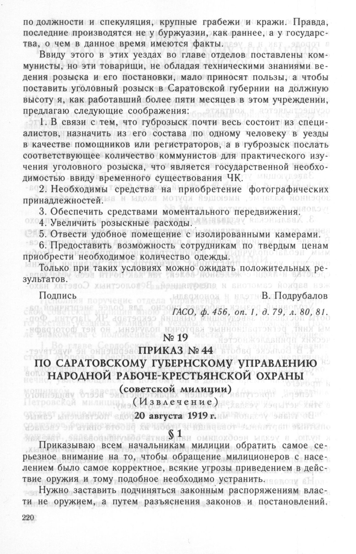 Приказ № 44 по Саратовскому Губернскому Управлению Народной рабоче-крестьянской охраны (советской милиции) (извлечение). 20 августа 1919 г. // ГАСО, ф. 456, oп. 1, д. 145, л. 17.