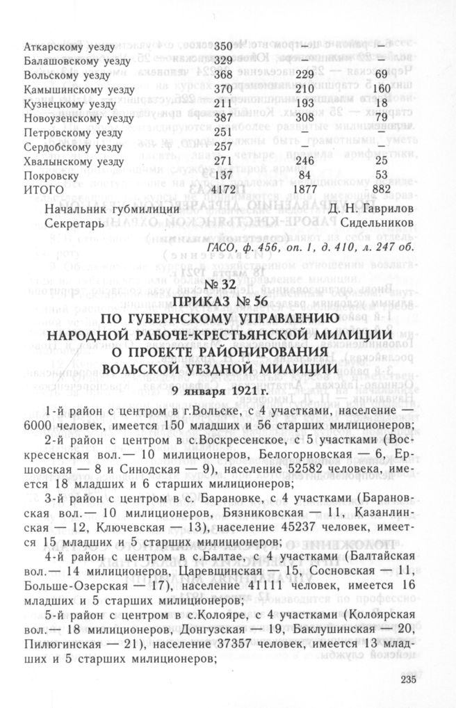 Приказ № 56 по Губернскому Управлению Народной рабоче-крестьянской милиции о проекте районирования Вольской уездной милиции. 9 января 1921 г. // ГАСО, ф. 456, oп. 1, д. 510, л. 4.