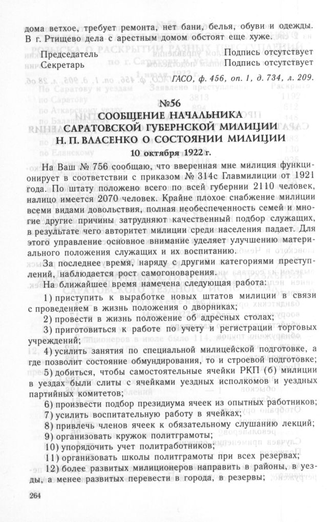 Сообщение Начальника Саратовской губернской милиции Н.П. Власенко о состоянии милиции. 10 октября 1922 г. // ГАСО, ф. 456, oп. 1, д. 886, л. 281.