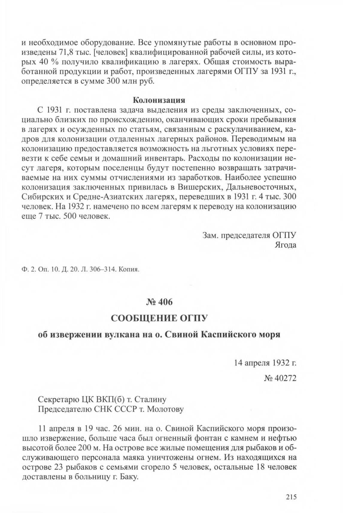 Сообщение ОГПУ об извержении вулкана на о. Свиной Каспийского моря. 14 апреля 1932 г. // ЦА ФСБ РФ. Ф. 2. Оп. 10. Д. 20. Л. 315. Копия.