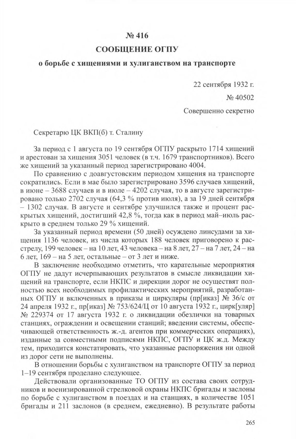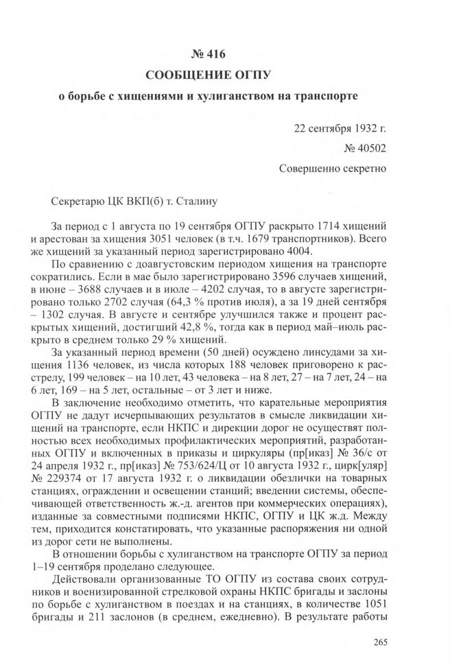 Сообщение ОГПУ о борьбе с хищениями и хулиганством на транспорте. 22 сентября 1932 г. // ЦА ФСБ РФ. Ф. 2. Оп. 10. Д. 21. Л. 118-120. Копия.