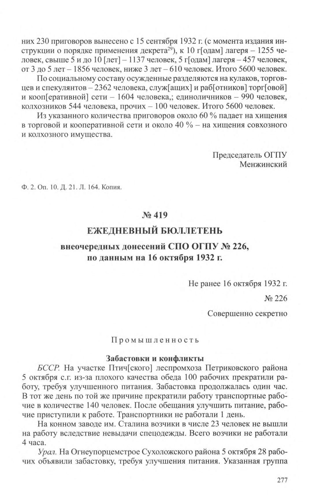 Ежедневный бюллетень внеочередных донесений СПО ОГПУ № 226, по данным на 16 октября 1932 г. Не ранее 16 октября 1932 г. // ЦА ФСБ РФ. Ф. 2. Оп. 10. Д. 514. Л. 181-190. Заверенная копия.