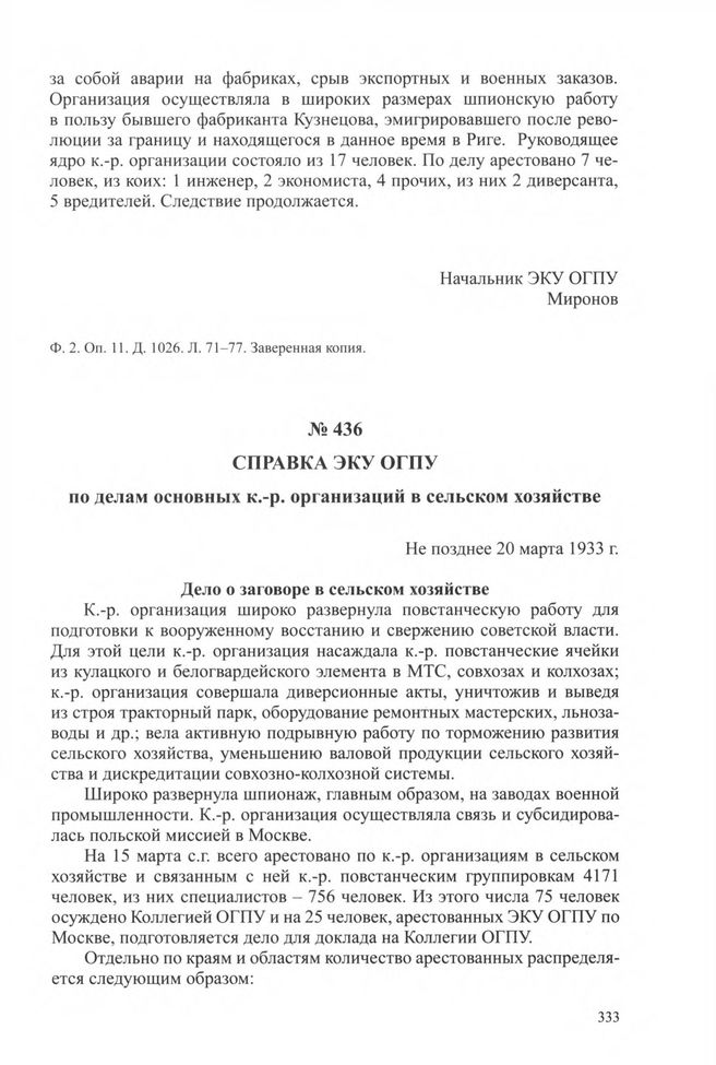 Справка ЭКУ ОГПУ по делам основных к.-р. организаций в сельском хозяйстве. Не позднее 20 марта 1933 г.