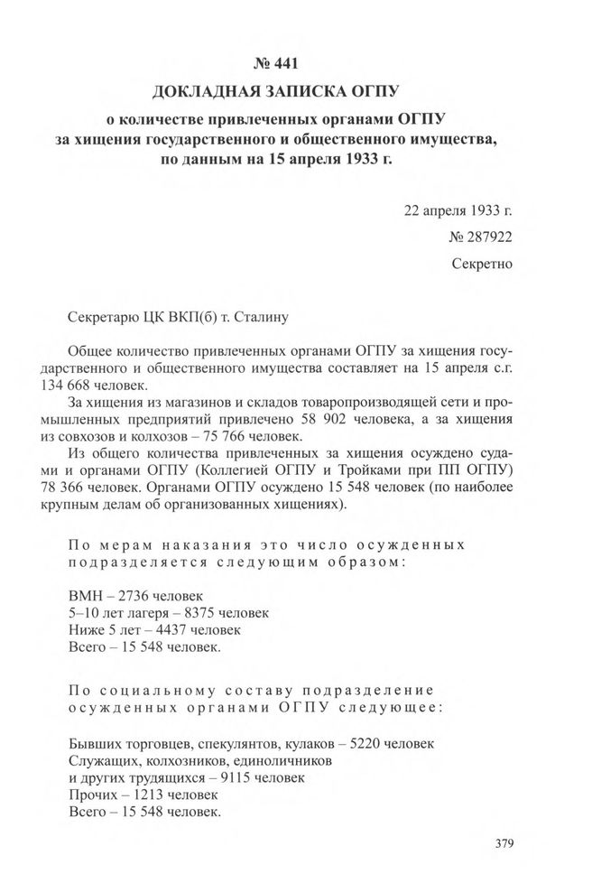 Докладная записка ОГПУ о количестве привлеченных органами ОГПУ за хищения государственного и общественного имущества, по данным на 15 апреля 1933 г. 22 апреля 1933 г. // ЦА ФСБ РФ. Ф. 2. Оп. 11. Д. 9. Л. 159-161. Заверенная копия.