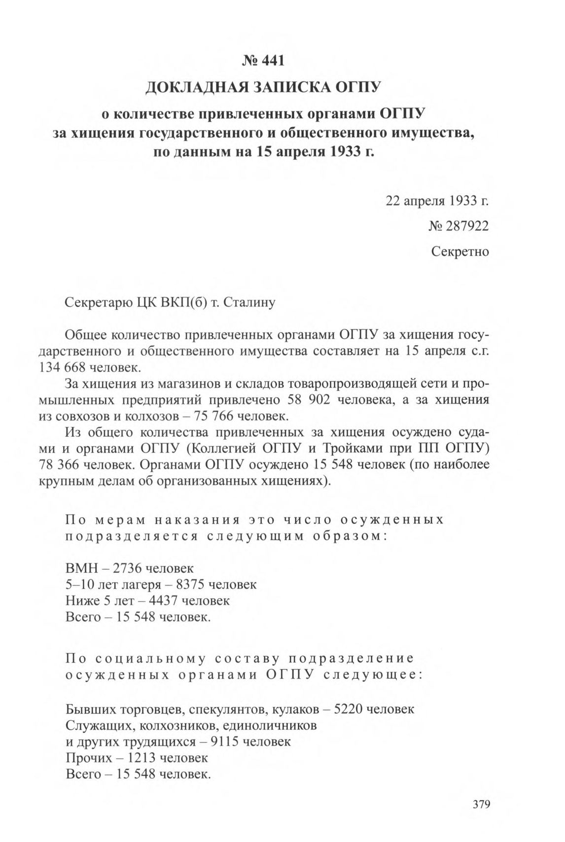 Докладная записка ОГПУ о количестве привлеченных органами ОГПУ за хищения государственного и общественного имущества, по данным на 15 апреля 1933 г. 22 апреля 1933 г.
