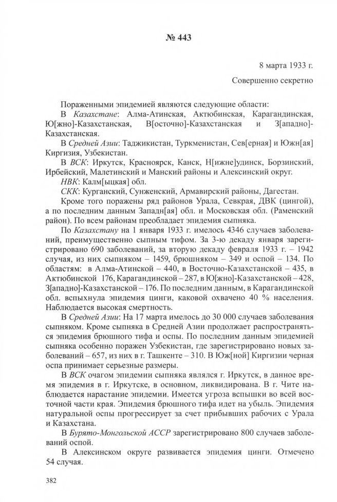 Спецсообщения ОГПУ об эпидемиях по Союзу ССР. 5 марта - 2 июля 1933 г. 8 марта 1933 г. // ЦА ФСБ РФ. Ф. 2. Оп. 11. Д. 33. Л. 3-5. Заверенная копия.