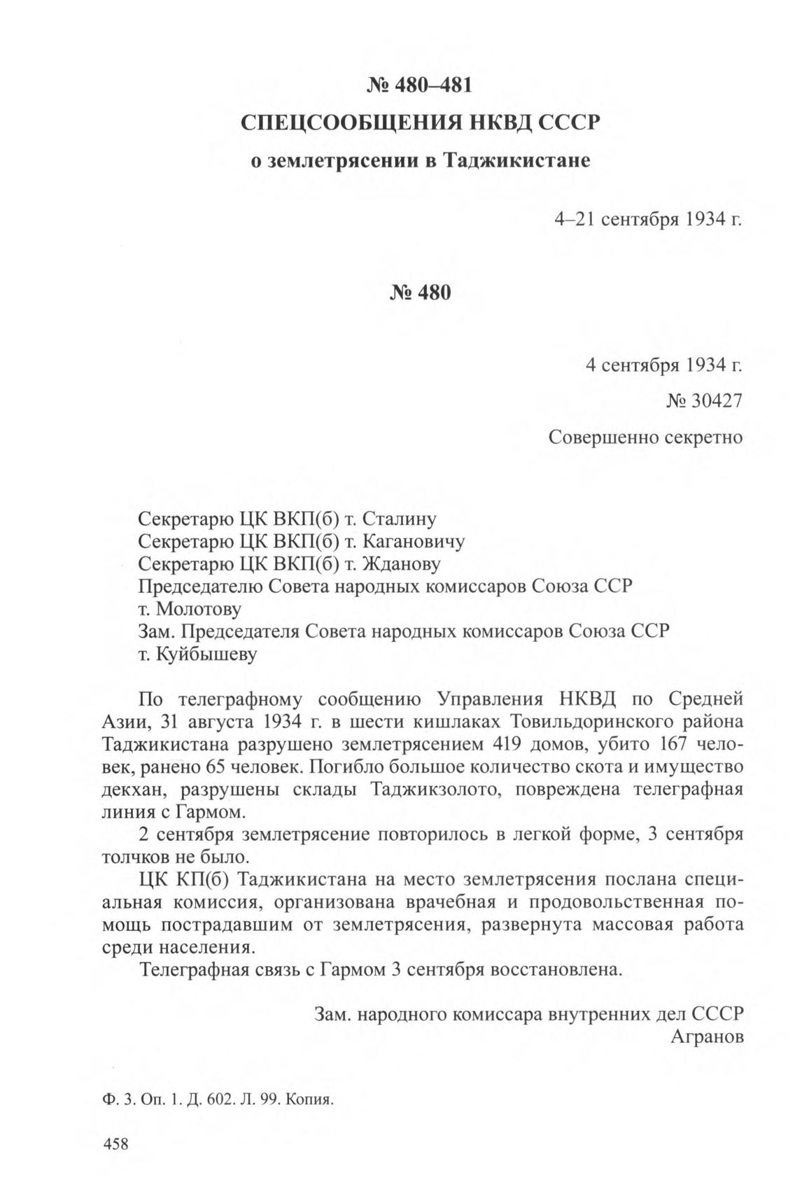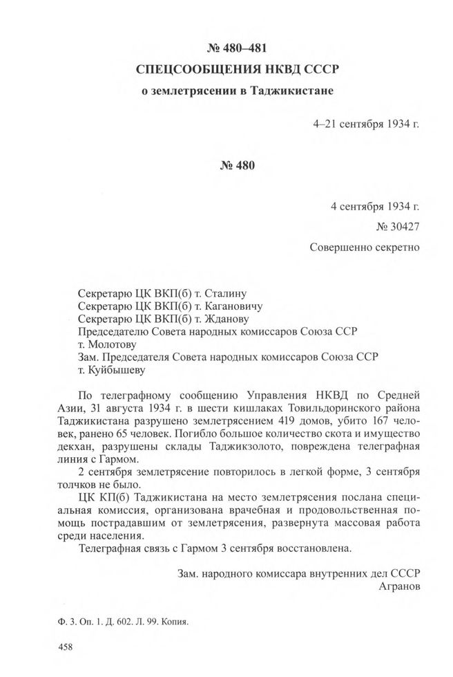 Спецсообщения НКВД СССР о землетрясении в Таджикистане. 4-21 сентября 1934 г. 4 сентября 1934 г. // ЦА ФСБ РФ. Ф. 3. Oп. 1. Д. 602. Л. 99. Копия.