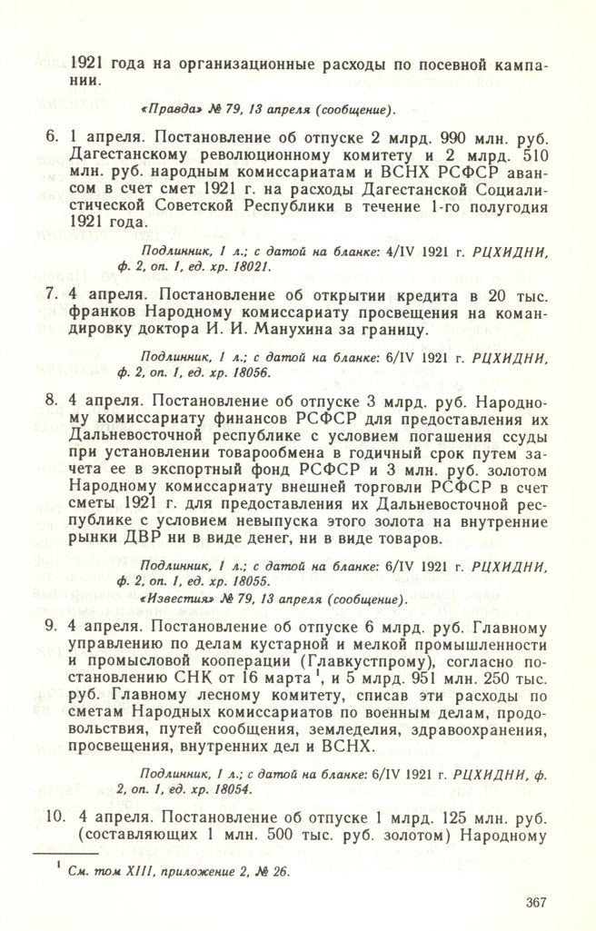 4 апреля. Постановление об отпуске 3 млрд. руб. Народному комиссариату финансов РСФСР для предоставления их Дальневосточной республике с условием погашения ссуды при установлении товарообмена в годичный срок путем зачета ее в экспортный фонд РСФСР и 3 млн. руб. золотом Народному комиссариату внешней торговли РСФСР в счет сметы 1921 г. для предоставления их Дальневосточной республике с условием невыпуска этого золота на внутренние рынки ДВР ни в виде денег, ни в виде товаров // Подлинник, 1 л.; с датой на бланке: 6/IV 1921 г. РЦХИДНИ, ф. 2, оп. 1, ед. хр. 18055. «Известия» № 79, 13 апреля (сообщение).