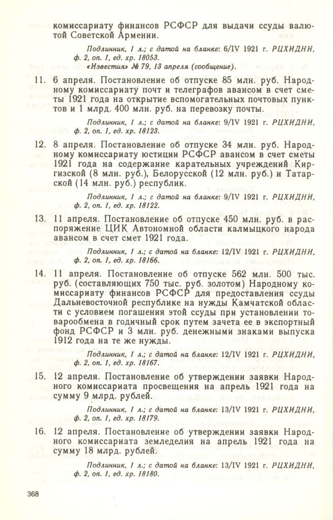 11 апреля. Постановление об отпуске 450 млн. руб. в распоряжение ЦИК Автономной области калмыцкого народа авансом в счет смет 1921 года // Подлинник, 1 л.; с датой на бланке: 12/IV 1921 г. РЦХИДНИ, ф. 2, оп. 1, ед. хр. 18166.