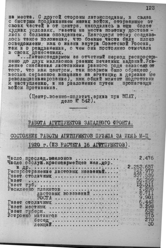 Состояние работы агитпунктов Пузапа за июль м-ц 1920 г. (Из расчета 16 агитпунктов) // АКА, д. № 198-278, л. 79.