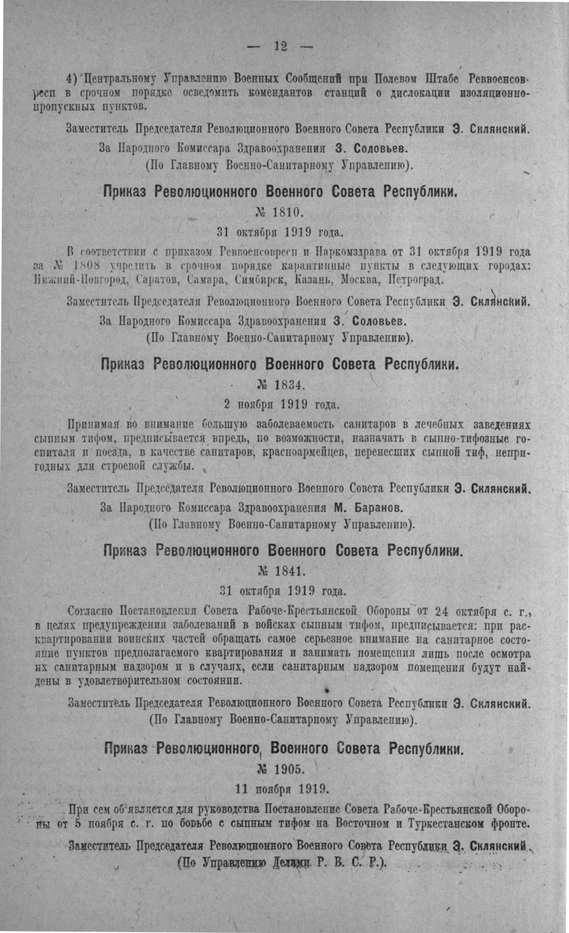 Постановление Совета Рабоче-Крестьянской обороны по борьбе с сыпным тифом на Восточном и Туркестанском фронте (Приказ Р.В.С.Р. № 1905. 11 ноября 1919 г.)