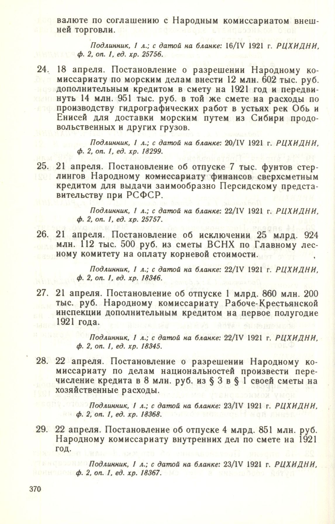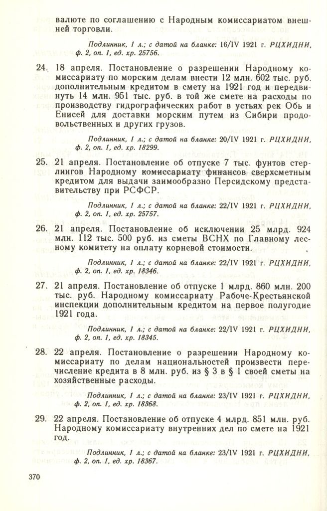 21 апреля. Постановление об исключении 25 млрд. 924 млн. 112 тыс. 500 руб. из сметы ВСНХ по Главному лесному комитету на оплату корневой стоимости // Подлинник, 1 л.; с датой на бланке: 22/IV 1921 г. РЦХИДНИ, ф. 2, оп. 1. ед. хр. 18346.