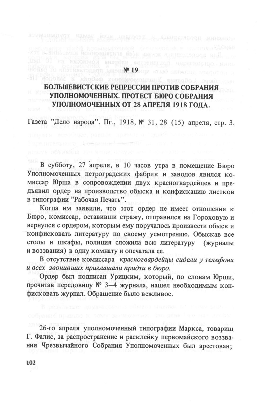 Большевистские репрессии против Собрания Уполномоченных. Протест Бюро Собрания Уполномоченных от 28 апреля 1918 года // Газета «Дело народа». Пг., 1918, № 31, 28 (15) апреля, стр. 3.