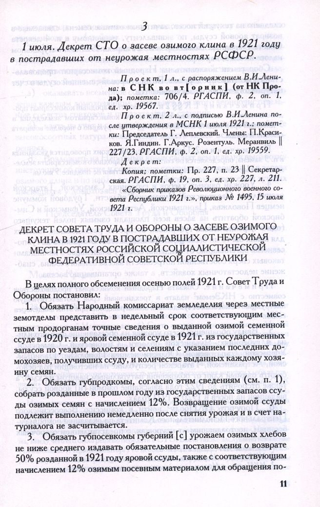 1 июля. Декрет СТО о засеве озимого клина в 1921 году в пострадавших от неурожая местностях РСФСР // Проект, 1 л., с распоряжением В.ИЛенина: в СНК во вторник (от НК Прода); пометка: 706/4. РГАСПИ, ф. 2, oп. 1, ед. хр. 19567. Проект, 2 л., с подписью В.И Ленина после утверждения в МСНК 1 июля 1921 г.; пометки: Председатель Г. Леплевский. Члены: П.Красиков. Я.Гиндин. Г.Аркус. Розентуль. Меранвиль || 227/23. РГАСПИ, ф. 2, oп. 1, ед. хр. 19559. Декрет: Копия; пометки: Пр. 227, п. 23 || Секретарская. РГАСПИ, ф. 19, oп. 3, ед. хр. 227, л. 211. «Сборник приказов Революционного военного совета Республики 1921 г.», приказ № 1495, 15 июля 1921 г.