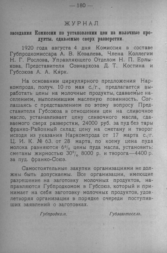 Комиссия по установлению цен на молочные продукты Вологодского Губпродкома