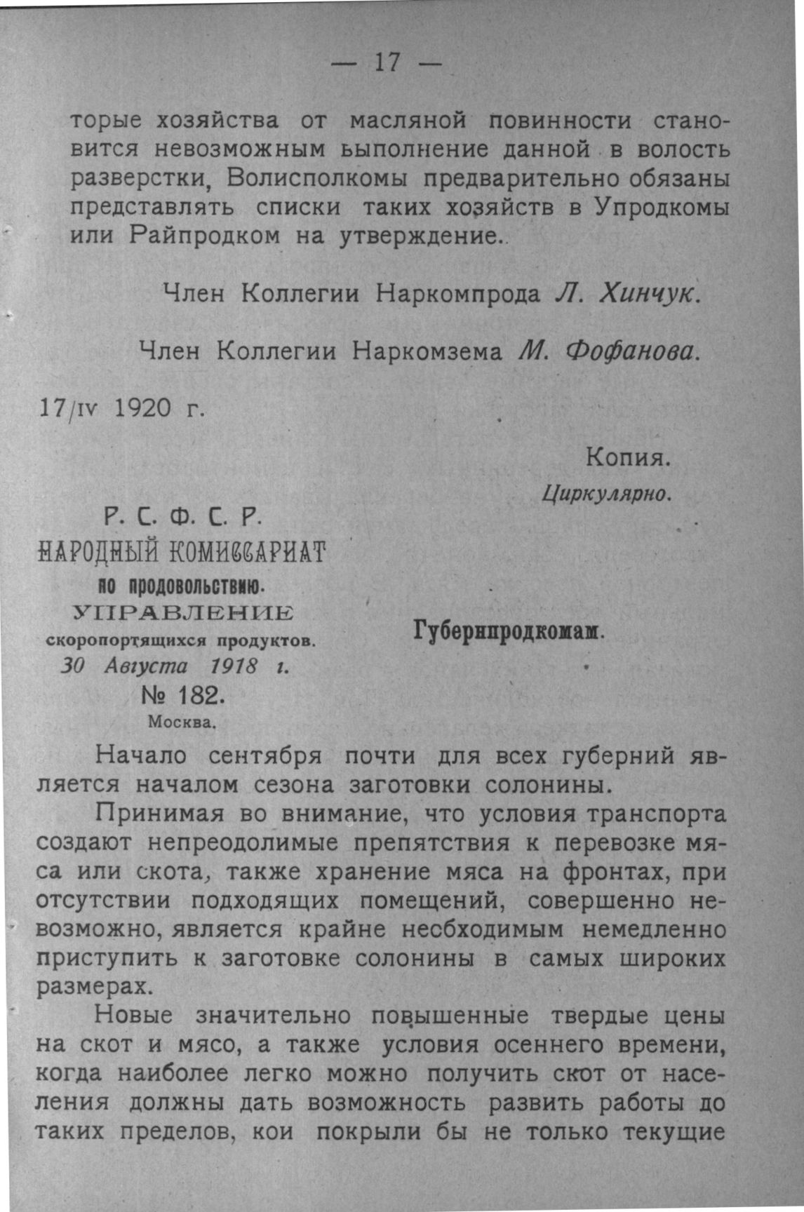 Циркуляр Управления скоропортящихся продуктов Наркомпрода Р.С.Ф.С.Р. о немедленной заготовке солонины № 182. 30 Августа 1918 г