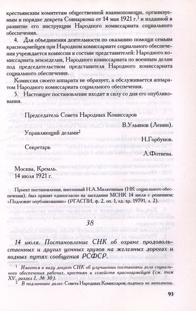 14 июля. Постановление СНК об охране продовольственных и других ценных грузов на железных дорогах и водных путях сообщения РСФСР // Проект, с подписью В.И.Ленина после утверждения; пометки: (Принято Малым СНК в заседании от 14 июля 1921 г.). Председатель А. Киселев. Члены: Меранвиль. Я.Гиндин. Розентуль. Хлоплянкин || Наркомюст Курский || Подлежит опубликованию. Пр. № 712, п. 20. РГАСПИ, ф. 2, oп. 1, ед. хр. 19793, л. 4—5. Постановление: Подлинник; пометка: Подлежит опубликованию. Пр. № 712, п. 20. РГАСПИ, там же, л. 1-3. «Известия» № 156, 19 июля; «Собрание Узаконений» № 55, cт. 341.