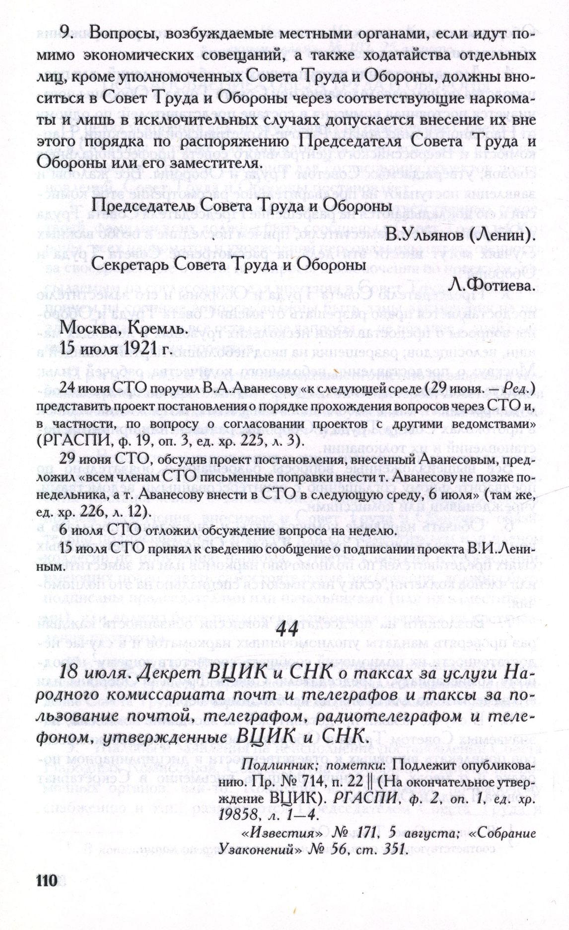 18 июля. Декрет ВЦИК и СНК о таксах за услуги Народного комиссариата почт и телеграфов и таксы за пользование почтой, телеграфом, радиотелеграфом и телефоном, утвержденные ВЦИК и СНК // Подлинник; пометки: Подлежит опубликованию. Пр. № 714, п. 22 || (На окончательное утверждение ВЦИК). РГАСПИ, ф. 2, оп. 1, ед. хр. 19858, л. 1-4. «Известия» № 171, 5 августа; «Собрание Узаконений» № 56, cт. 351.