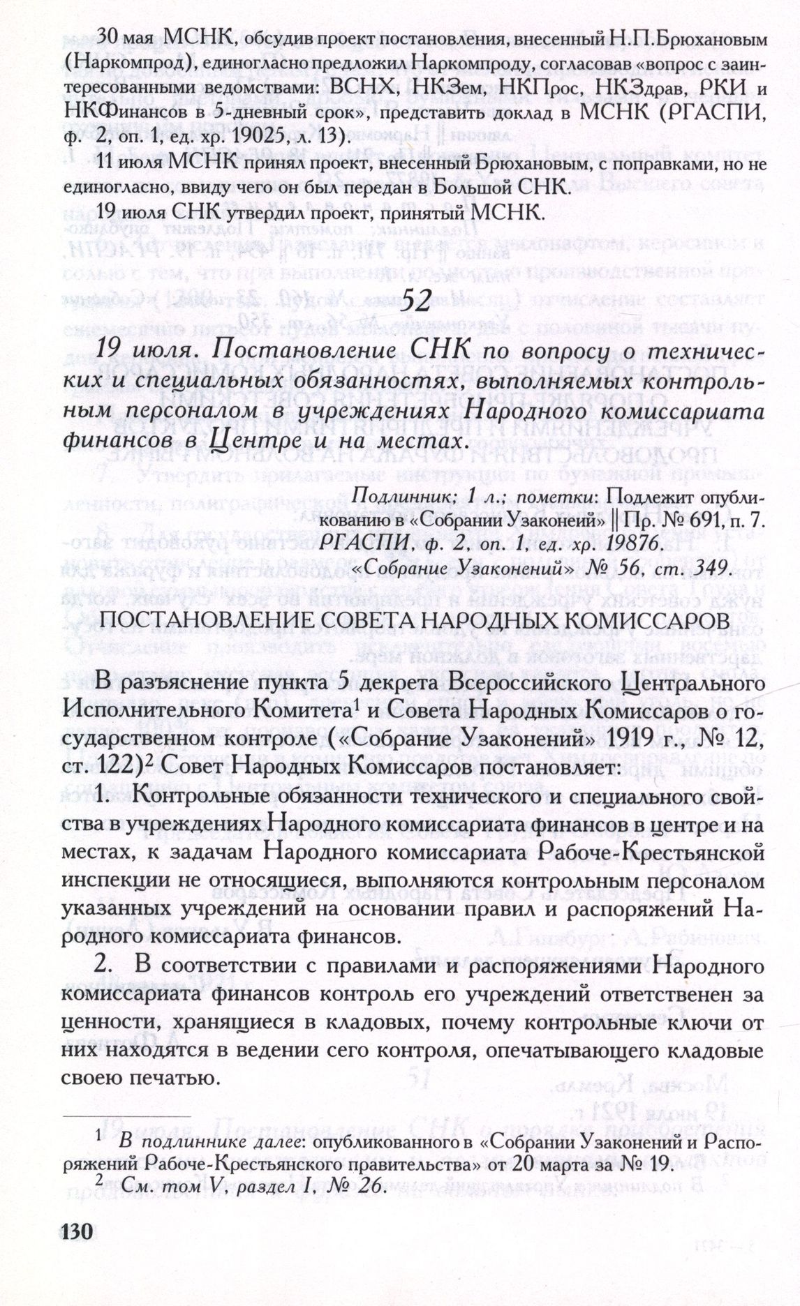19 июля. Постановление СНК по вопросу о технических и специальных обязанностях, выполняемых контрольным персоналом в учреждениях Народного комиссариата финансов в Центре и на местах // Подлинник; 1 л.; пометки: Подлежит опубликованию в «Собрании Узаконеий» || Пр. № 691, п. 7. РГАСПИ, ф. 2, oп. 1, ед. хр. 19876. «Собрание Узаконений» № 56, cт. 349.