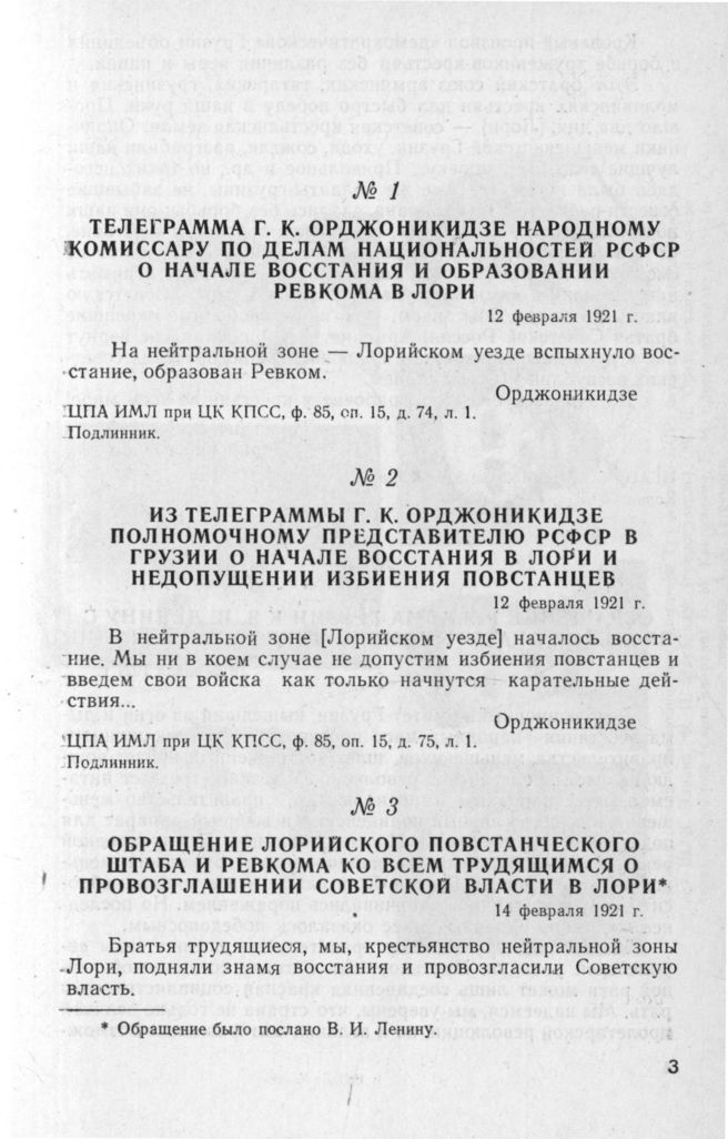 Телеграмма Г.К. Орджоникидзе Народному Комиссару по делам национальностей РСФСР о начале восстания и образовании Ревкома в Лори. 12 февраля 1921 г. // ЦПА ИМЛ при ЦК КПСС, ф. 85, оп. 15, д. 74, л. 1. Подлинник.