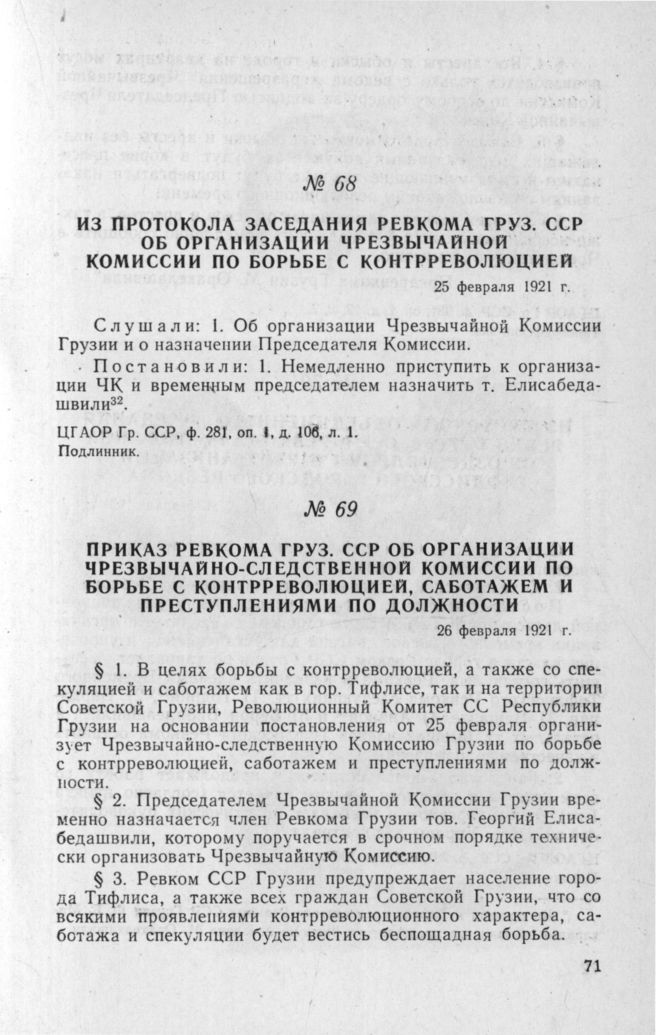 Из протокола заседания Ревкома Груз. ССР об организации Чрезвычайной Комиссии по борьбе с контрреволюцией. 25 февраля 1921 г.