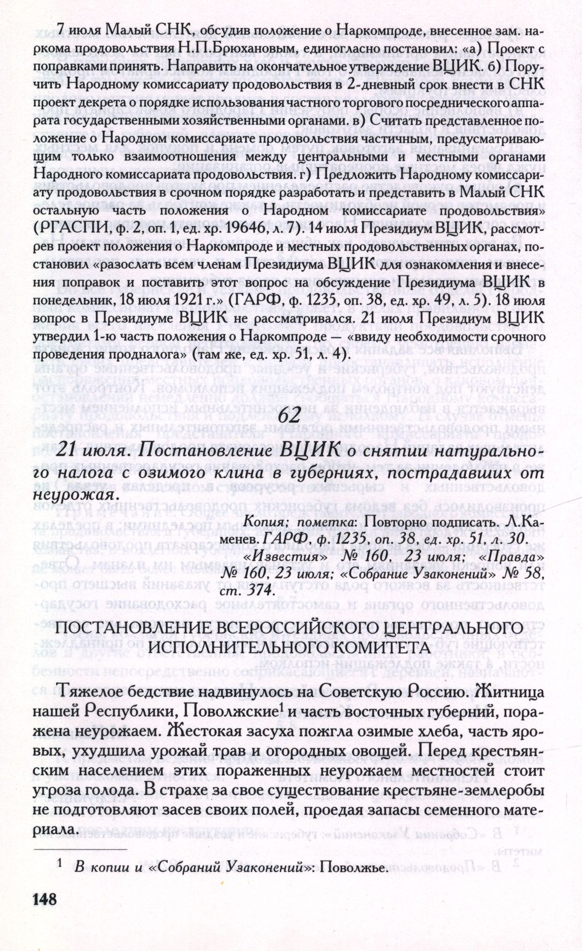 21 июля. Постановление ВЦИК о снятии натурального налога с озимого клина в губерниях, пострадавших от неурожая // Копия; пометка: Повторно подписать. Л.Каменев. ГА РФ, ф. 1235, оп. 38, ед. хр. 51, л. 30. «Известия» № 160, 23 июля; «Правда» № 160, 23 июля; «Собрание Узаконений» № 58, cт. 314.