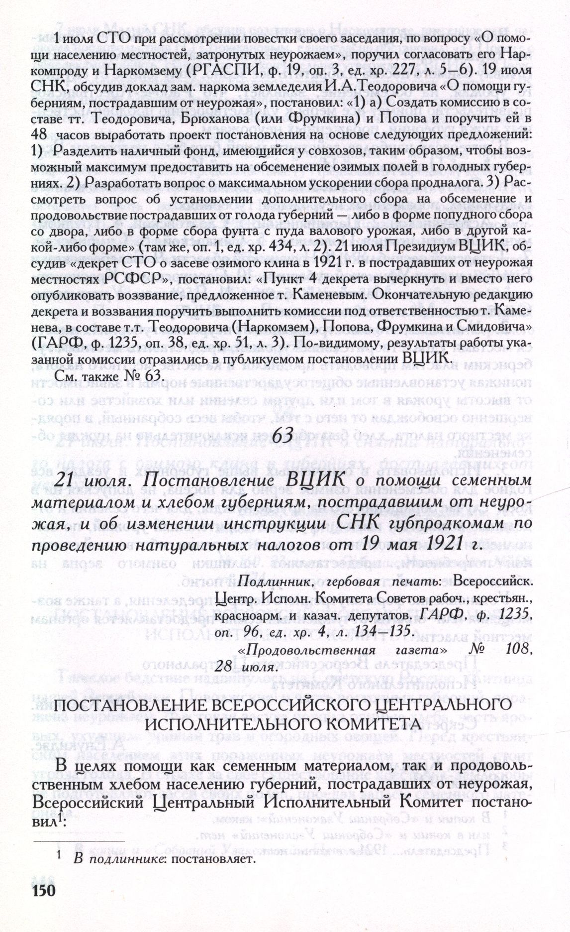 21 июля. Постановление ВЦИК о помощи семенным материалом и хлебом губерниям, пострадавшим от неурожая, и об изменении инструкции СНК губпродкомам по проведению натуральных налогов от 19 мая 1921 г. // Подлинник, гербовая печать: Всероссийск. Центр. Исполн. Комитета Советов рабоч., крестьян., красноарм. и казач. депутатов. ГА РФ, ф. 1235, оп. 96, ед. хр. 4, л. 134—135. «Продовольственная газета» № 108, 28 июля.