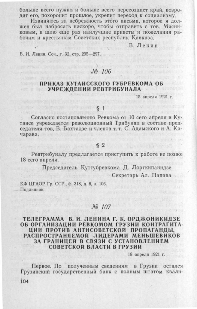 Приказ Кутаисского Губревкома об учреждении Ревтрибунала. 15 апреля 1921 г. // КФ ЦГАОР Гр. ССР, ф. 318, д. 6, л. 106. Подлинник.