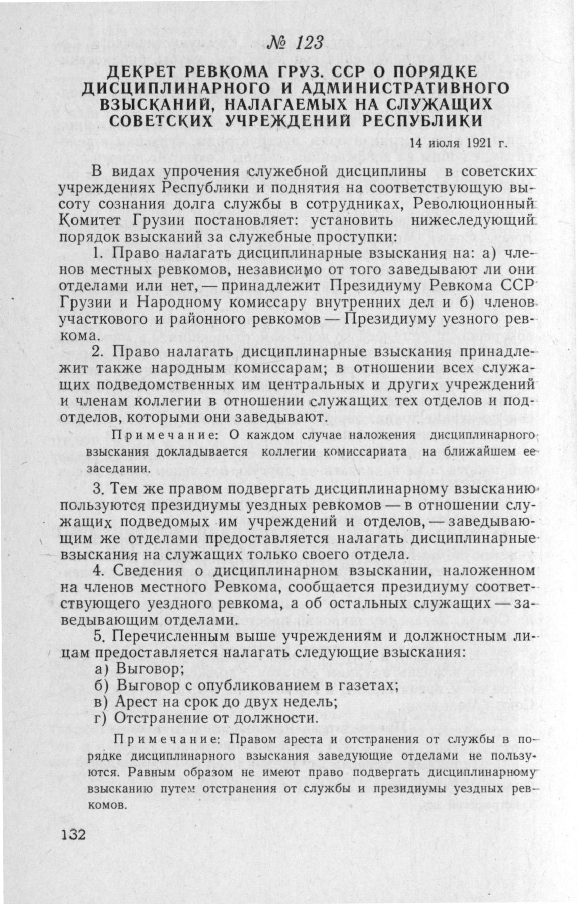 Декрет Ревкома Груз. ССР о порядке дисциплинарного и административного взысканий, налагаемых на служащих советских учреждений республики. 14 июля 1921 г.
