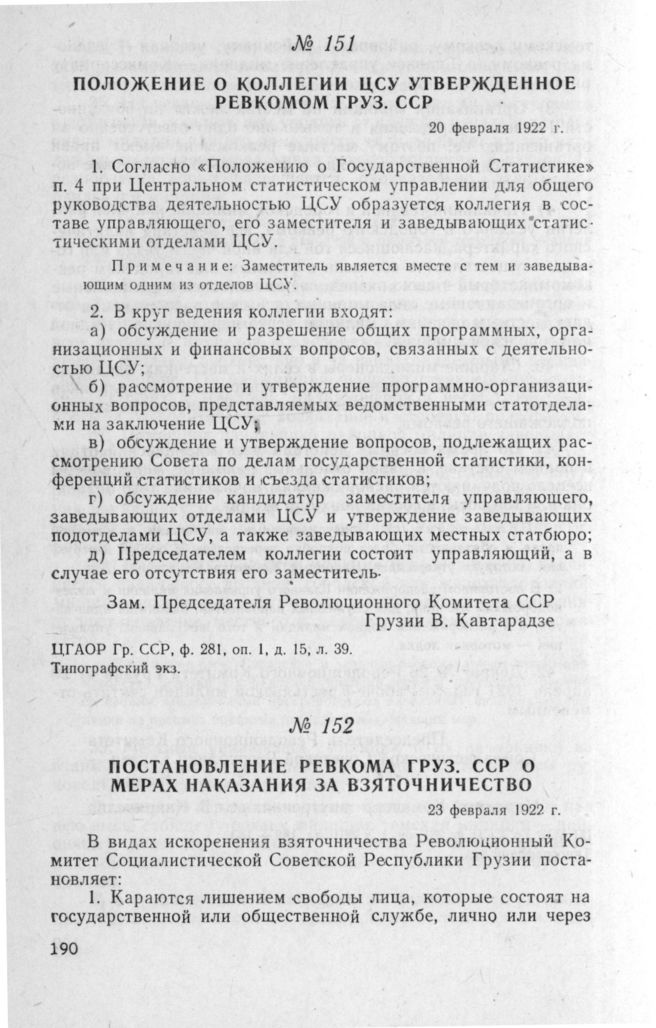 Положение о Коллегии ЦСУ утвержденное Ревкомом Груз. ССР. 20 февраля 1922 г. // ЦГАОР Гр. ССР, ф. 281, oп. 1, д. 15, л. 39. Типографский экз.