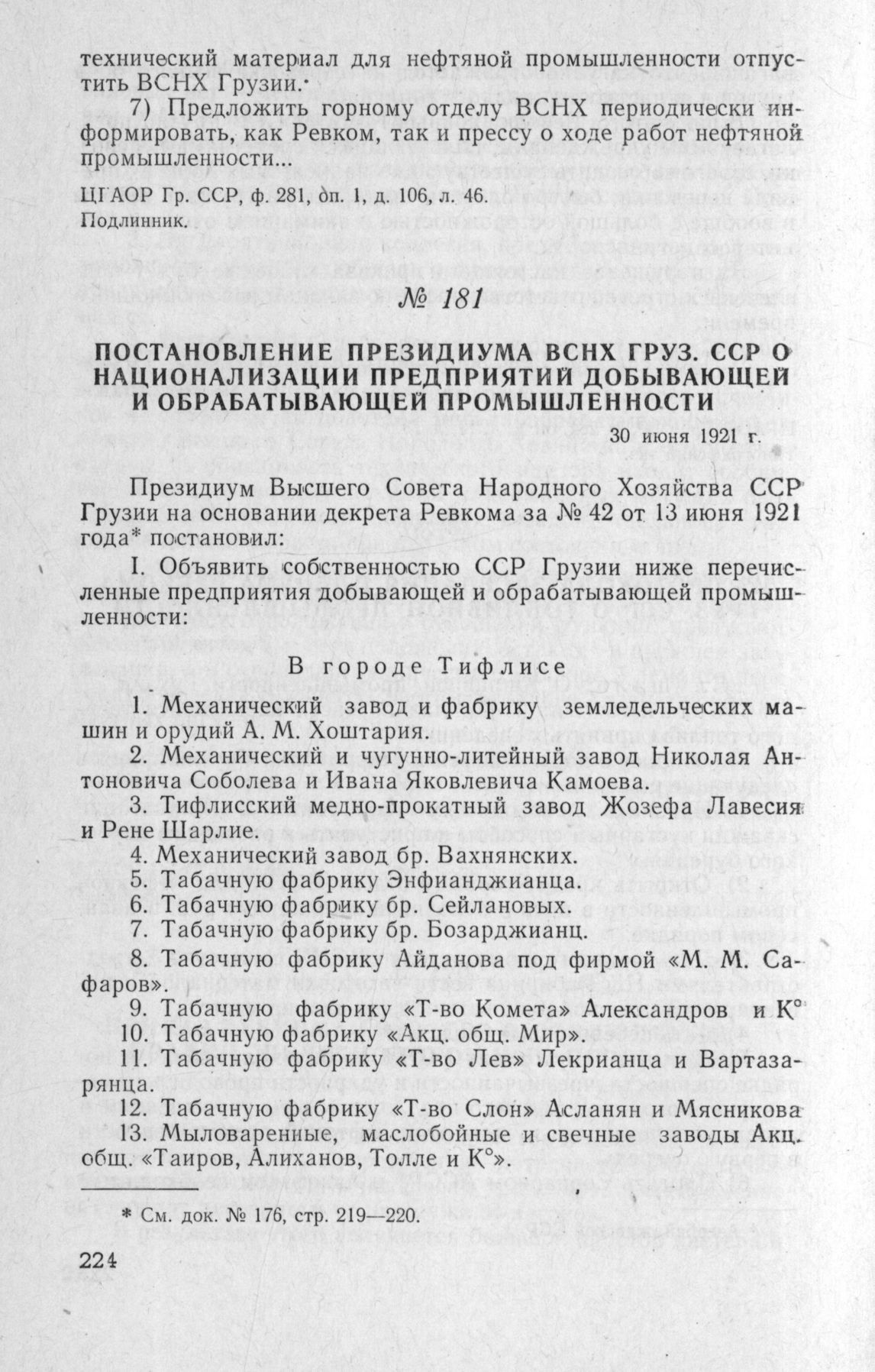 Постановление Президиума ВСНХ Груз. ССР о национализации предприятий добывающей и обрабатывающей промышленности. 30 июня 1921 г.