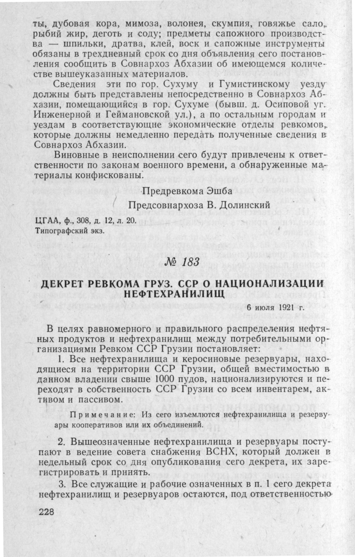 Декрет Ревкома Груз. ССР о национализации нефтехранилищ. 6 июля 1921 г.
